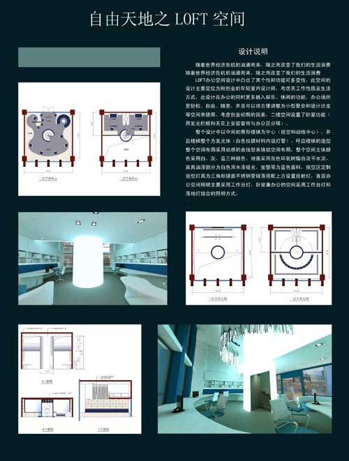 LOFT办公空间设计中凸出了其个性和功能可多变性,此空间的设计主要定位为刚创业的年轻室内设计师,考虑其工作性质及生活方式,此设计在办公的同时更多融入娱乐、休闲的功能,办公场所更轻松、自由、随意,并且可以很方便调整为小型聚会和设计沙龙等空间来使用,考虑创业初期的因素,二楼空间设置了卧室功能(用发光栏板和天花上安装窗帘与办公区分隔)。